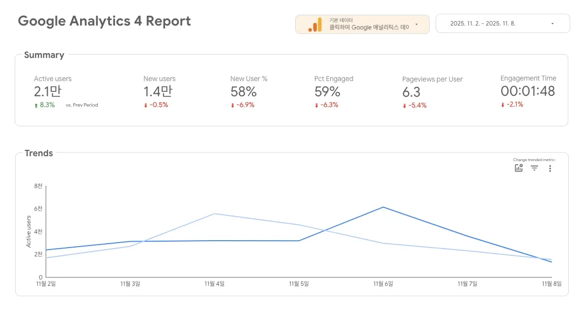 지표를 확인하기 위해 GA4, CRM, 엑셀을 오가다 보면, 정작 중요한 인사이트 도출이나 전략 수정에는 손을 대기 어렵게 됩니다.이럴 때 AI 기반 리포트 자동화를 도입하면, 반복적인 지표 확인 업무를 최소화하고 실무자는 인사이트 도출에 집중할 수 있습니다.