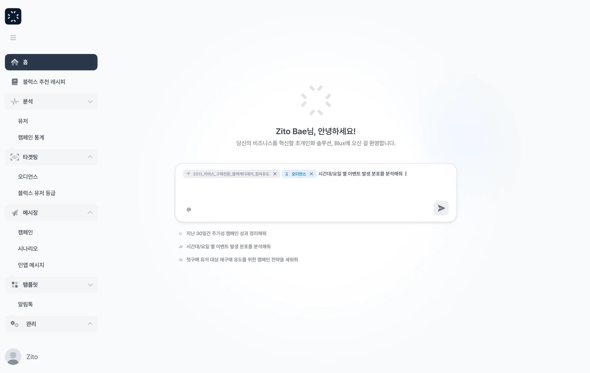 이때 필요한 것이 바로 AI CRM 에이전트, Blux입니다. Blux는 우리 서비스 데이터와 브랜드 톤에 대한 context를 이미 학습하고 있기 때문에, 매번 복잡한 설명 없이도 위 네 가지 단계를 아우르는 개인화 캠페인을 설계·실행할 수 있습니다.