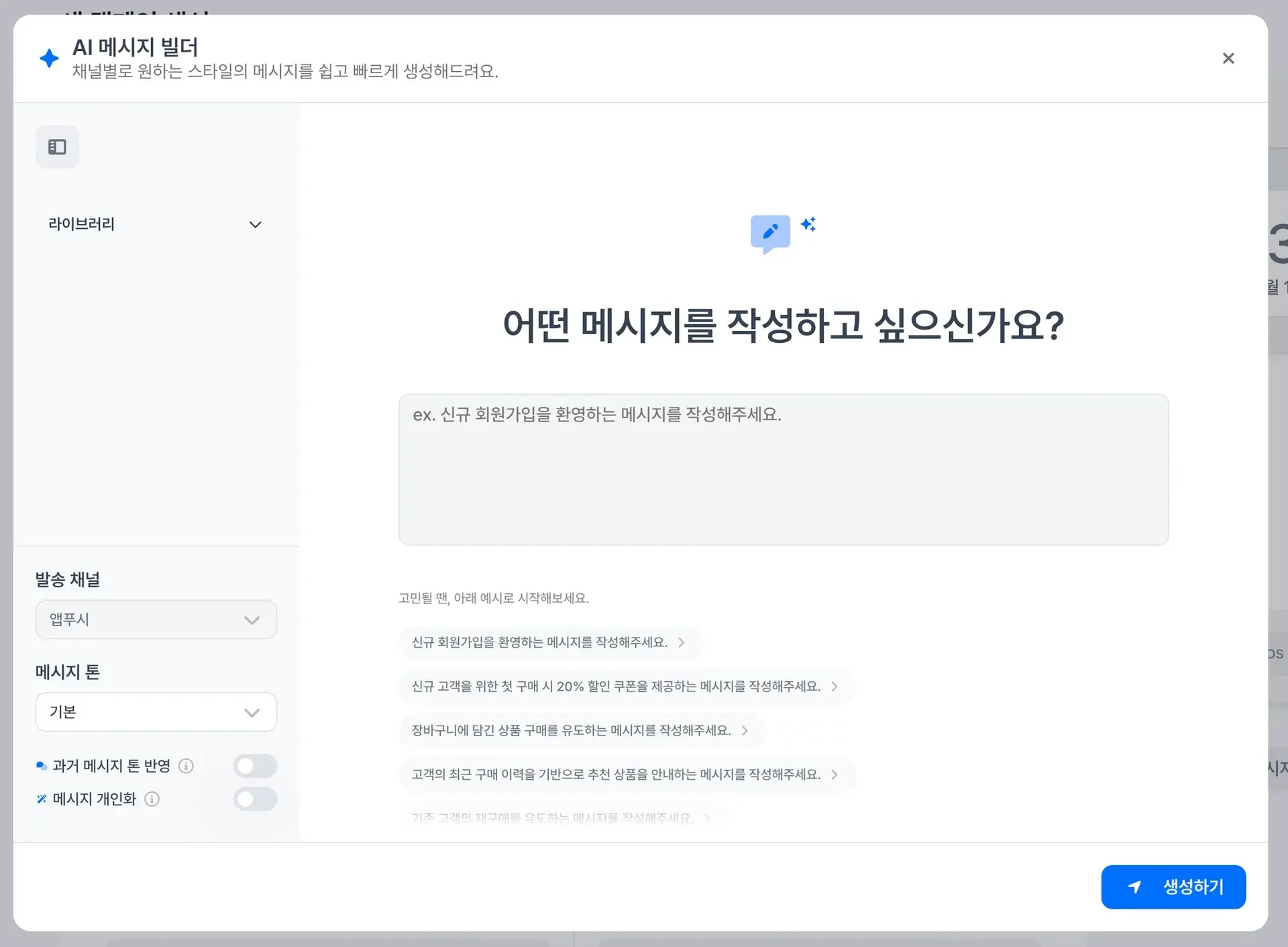 클릭률을 높이기 위해선 고객 이름, 지난 구매 제품명, 계절 변수, 피부 고민까지 반영된 개별화 메시지가 필수입니다. 하지만 이를 매번 수작업으로 만드는 건 현실적으로 어렵죠.