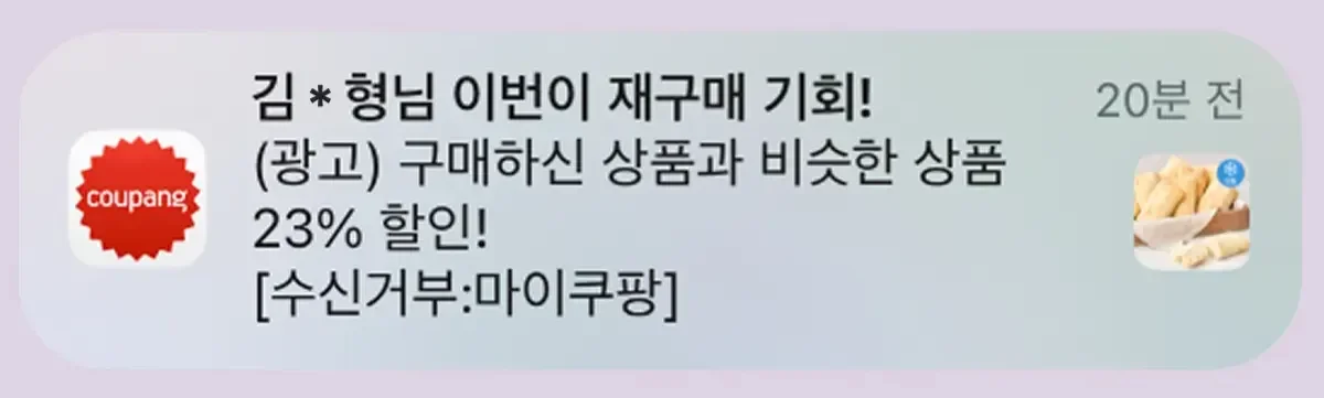 쿠팡은 고객의 구매 이력과 상품 카테고리 데이터를 분석해, 각 고객의 재구매 예상 시점에 맞춰 Push 메시지를 발송합니다. 이때 할인 정보나 가격 혜택을 함께 노출해 클릭을 유도하고 있어요! 식품처럼 대체재가 많고, 브랜드 충성도가 낮은 카테고리에서는 가격 중심의 리마인드 메시지가 가장 효과적입니다.