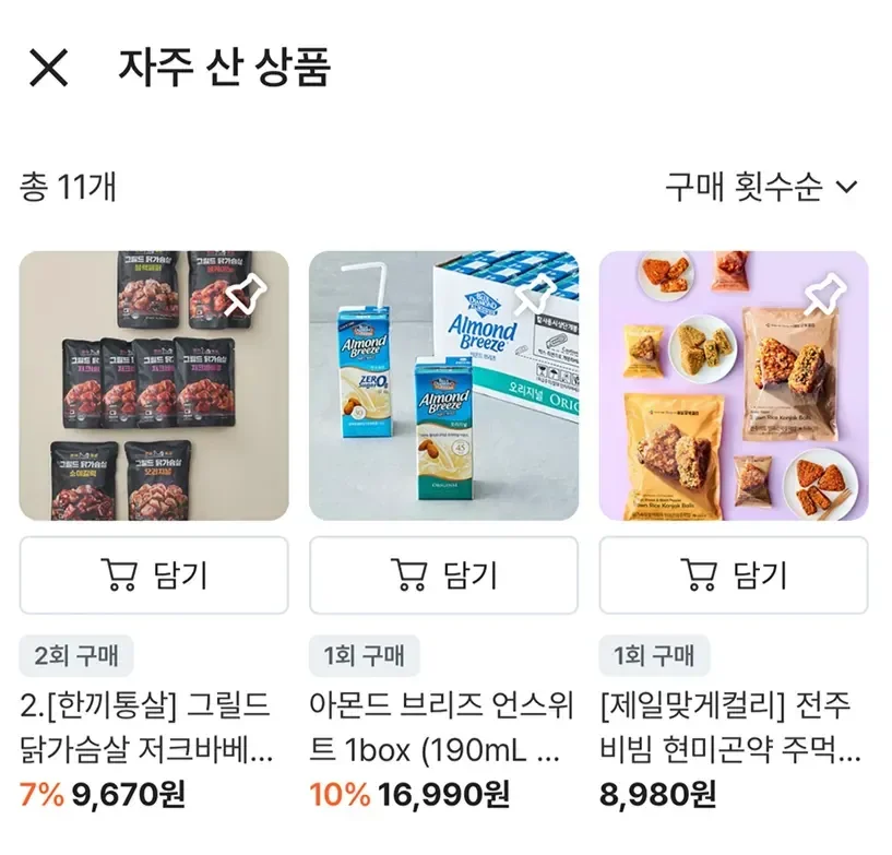 “고객님이 자주 구매하신 [닭가슴살·아몬드브리즈]가 모두 할인 중이에요. 바로 장보기 하시겠어요?”