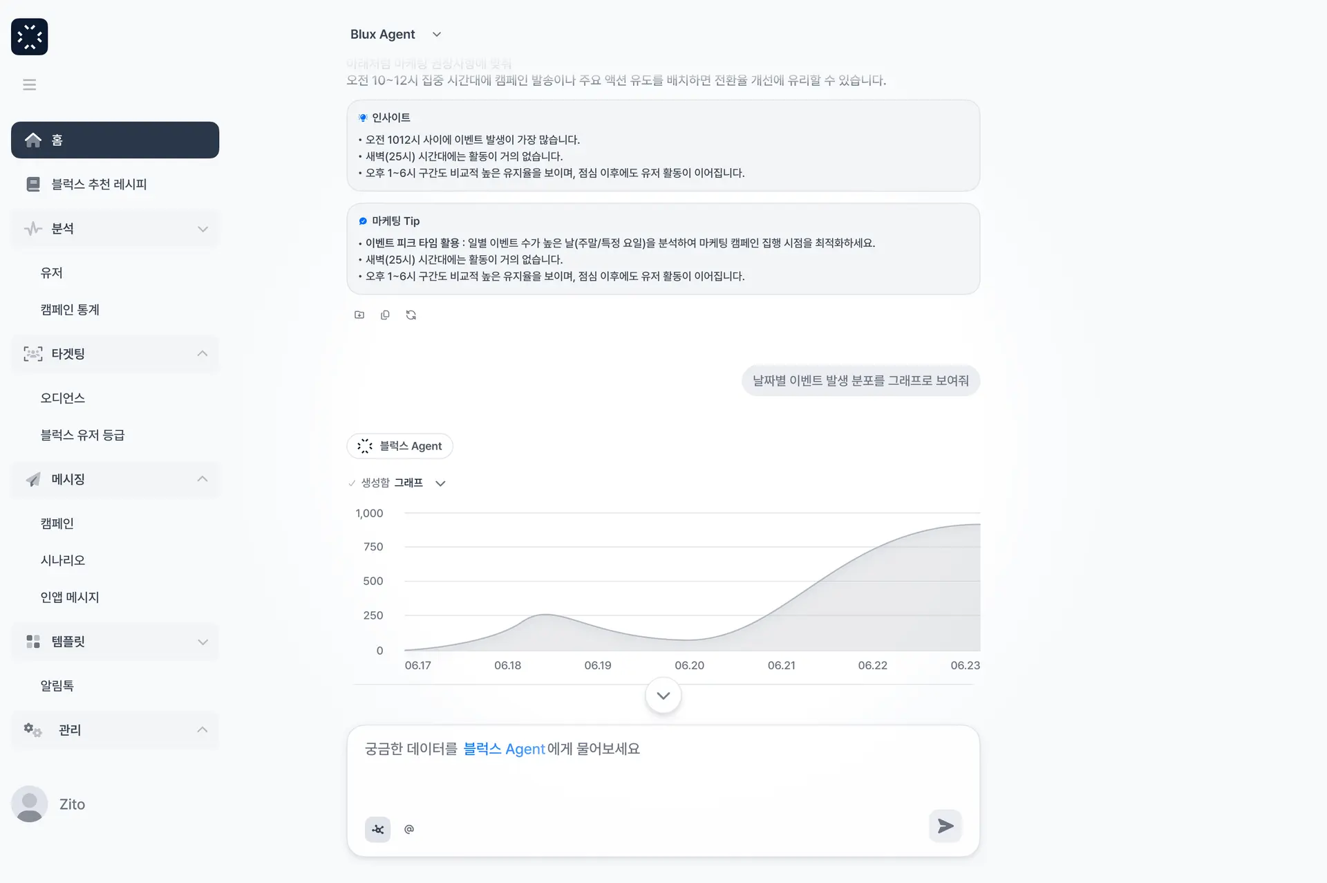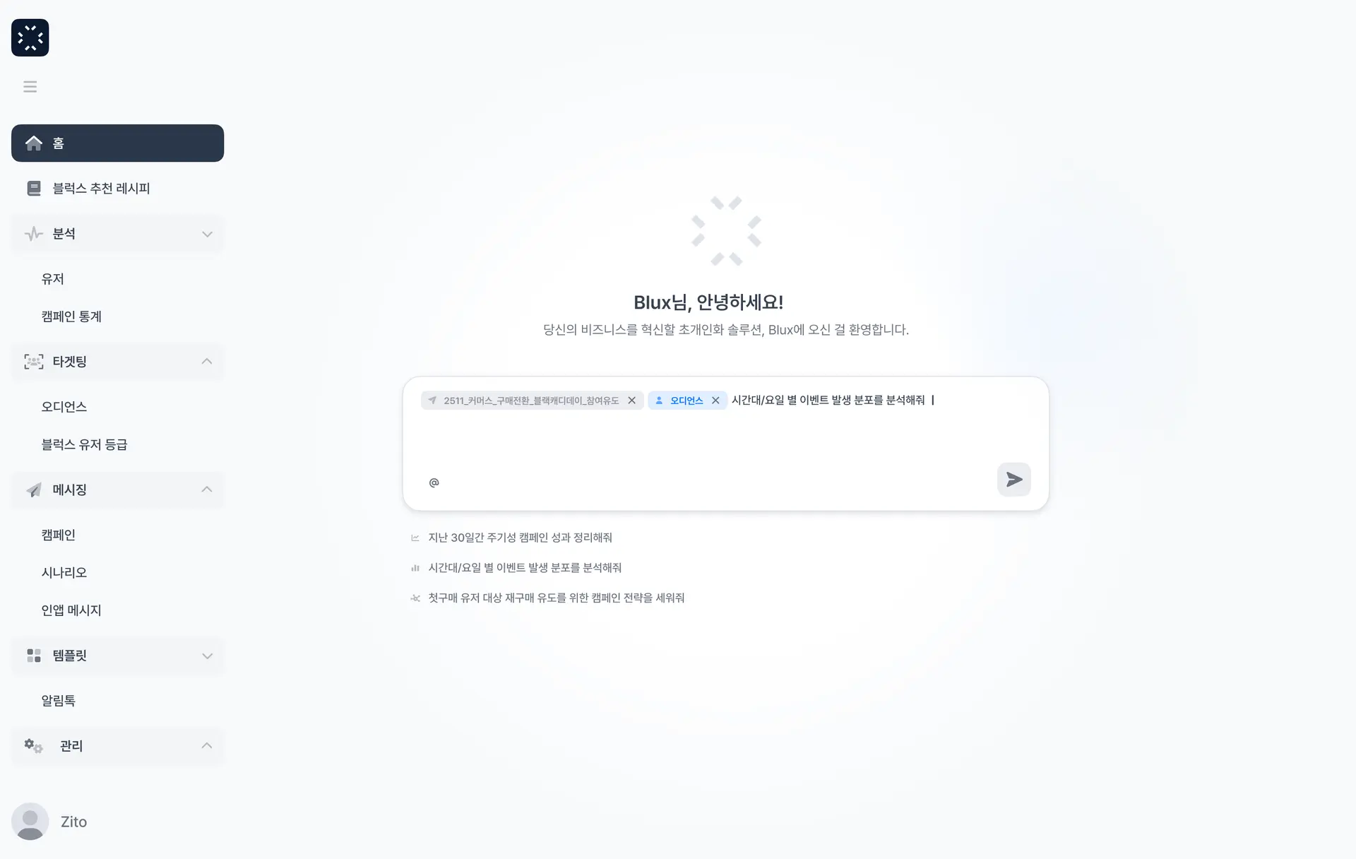 이제 데이터팀 없이도 고객의 행동 패턴을 정교하게 분석하고, 실시간으로 다음 마케팅 액션에 반영할 수 있습니다. 블럭스 AI가 그 모든 과정을 쉽게 실행하도록 도와드릴게요.