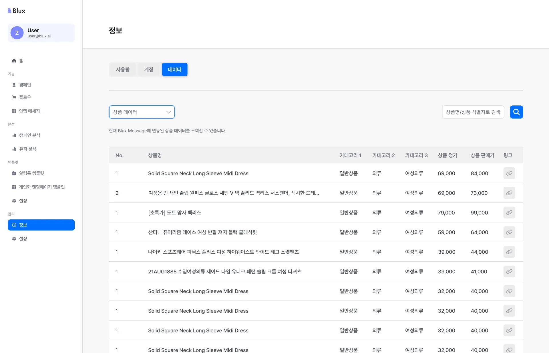 이제 대시보드의 정보 > 데이터 > 상품 데이터 탭에서 연동된 상품의 모든 정보를 한눈에 확인할 수 있습니다.