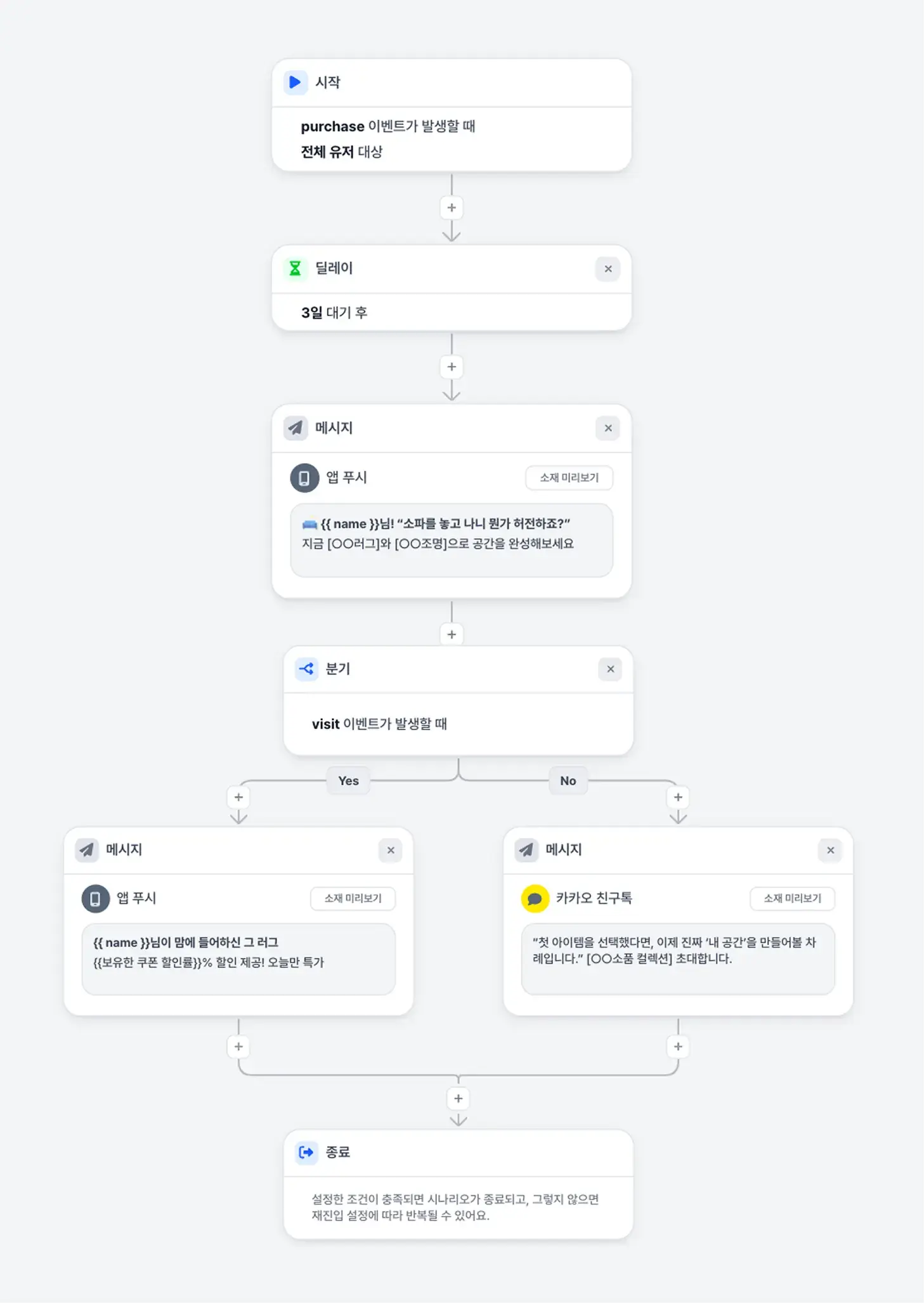 고객이 특정 행동(예: 구매 완료)을 했을 때 자동으로 플로우가 시작되고, +3일, +5일 등 원하는 시점에 개인화된 푸시 메시지를 발송할 수 있습니다.