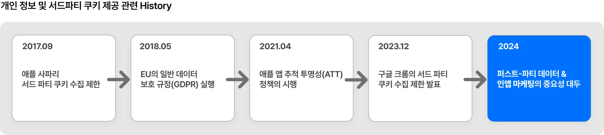 이제 기업들은 이전처럼 써드파티가 아닌, 자체 환경(웹페이지, 모바일 앱 등) 내에서 이용자의 데이터를 확보하고 이를 기반으로 다양한 지표 관리를 수행해야 합니다. 이에 따라 기업들은 기존의 매출 수준을 유지하기 위해 오히려 광고비를 더 많이 사용하거나 잘못된 정보로 엉뚱한 곳에 비용을 쓰는 일이 늘어나게 되었습니다. 그리고 이를 해결하기 위해 자체 확보한 이용자 데이터를 바탕으로 광고 효율을 높이는 다양한 솔루션이 시장에 등장했습니다.