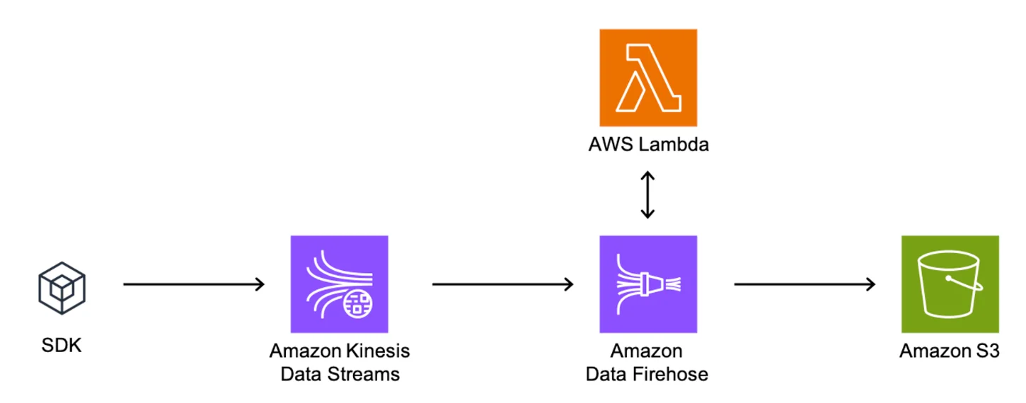 위 그림에서 ‘람다(Lambda)’는 아마존이 서비스 일부로 제공하는 사건 기반 서버리스 컴퓨팅 플랫폼입니다. 람다는 데이터를 변형(transform), 필터링(filter), 압축 해제(decompress), 변환(convert), 및 가공(process)하기 위해서 사용될 수 있습니다.