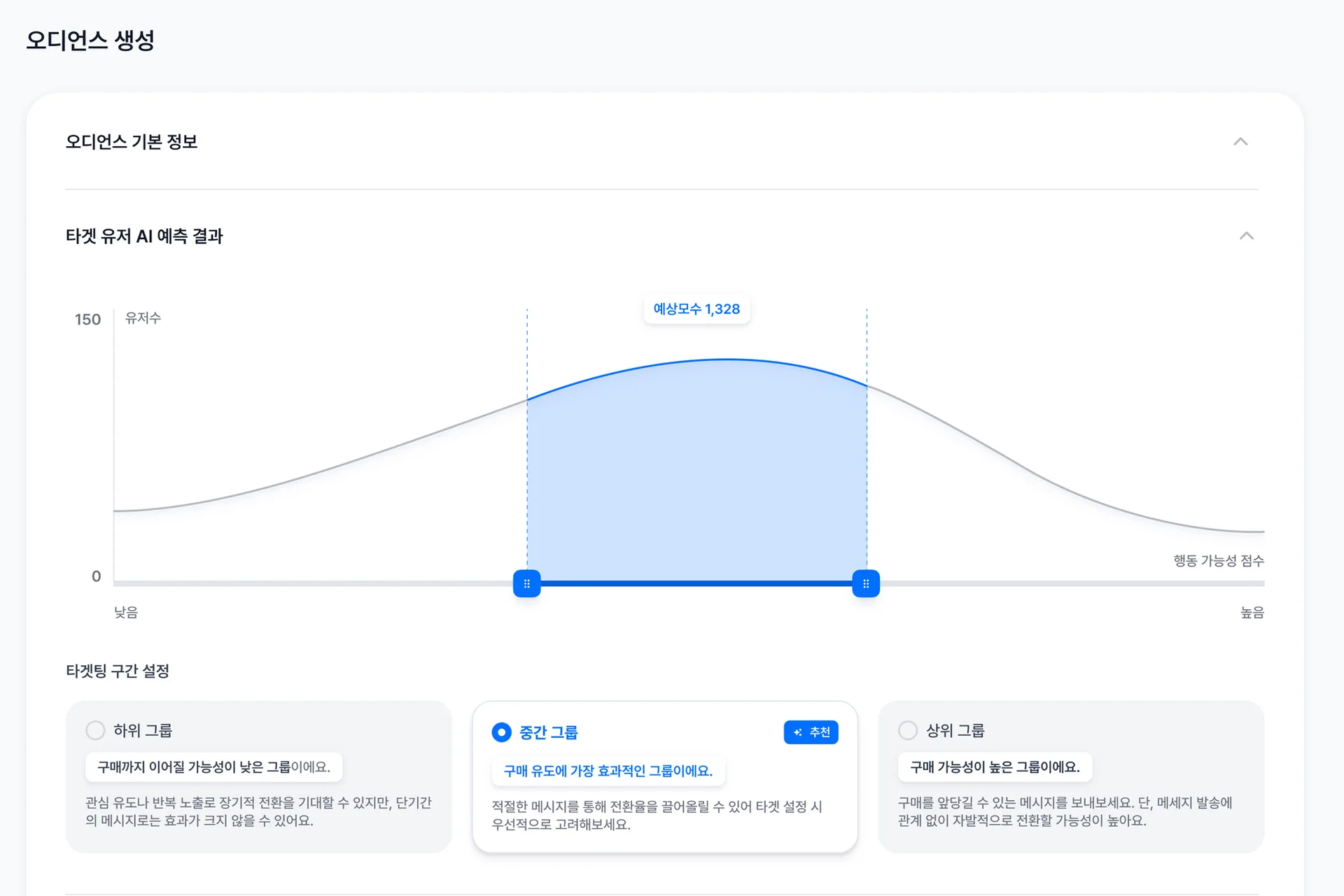 AI 오디언스는 단순한 자동 타겟팅을 넘어, 원하는 기준에 따라 직접 오디언스를 만들 수 있도록 개선되었습니다. 예를 들어, AI가 예측한 점수 구간 중 원하는 구간을 선택하여 오디언스를 만들 수 있으며, 각 점수 구간에 대한 AI 예측 결과는 다양한 통계지표로 확인할 수 있습니다.