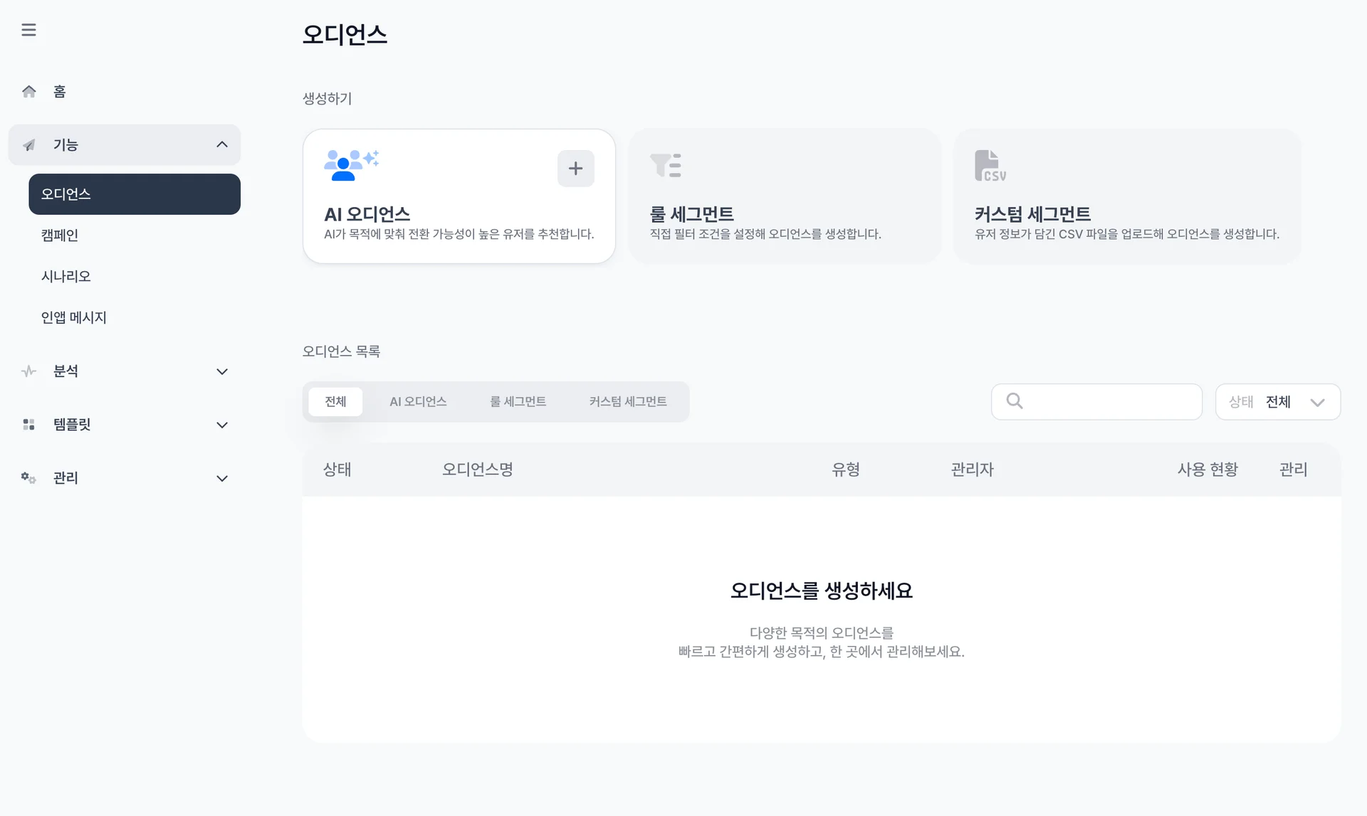 오디언스는 캠페인과 시나리오에서 발송 대상을 미리 정의하고 관리할 수 있는 기능입니다. 기존에는 캠페인이나 시나리오를 만들 때마다 매번 발송 대상을 새로 설정해야 했으며, 커스텀 세그먼트는 별도로 생성하고 관리해야 하는 불편함이 있었습니다.