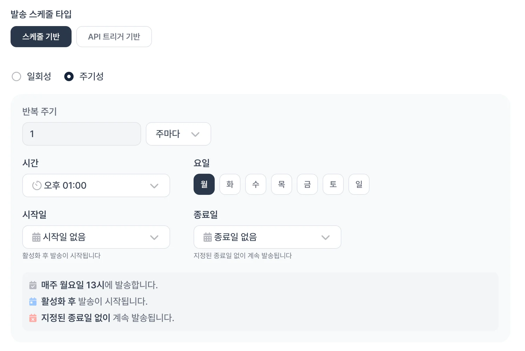 또한, 종료일이 없는 캠페인 운영을 위해 ‘종료일 없음’ 옵션도 함께 추가되어 장기적으로 운영되는 메시지 발송에도 유연하게 사용할 수 있습니다.