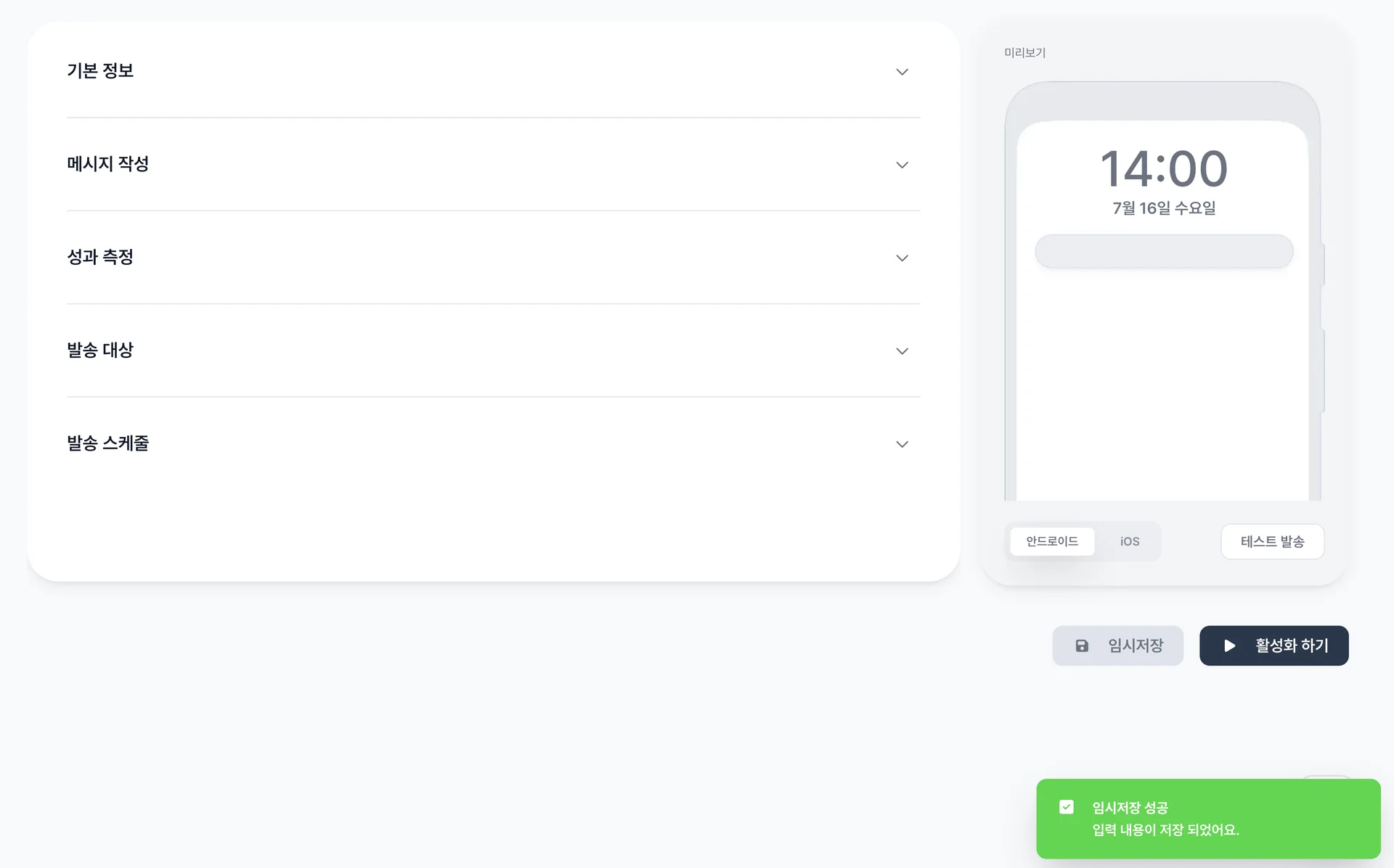 기존에는 필수 항목을 모두 입력하지 않으면 임시저장이 불가능해 작업 중간에 저장할 수 없다는 불편함이 있었는데요, 이번 업데이트를 통해 필수값이 입력되지 않아도 임시저장이 가능해져, 캠페인 및 시나리오 작업을 더 편리하게 이어갈 수 있게 되었습니다.